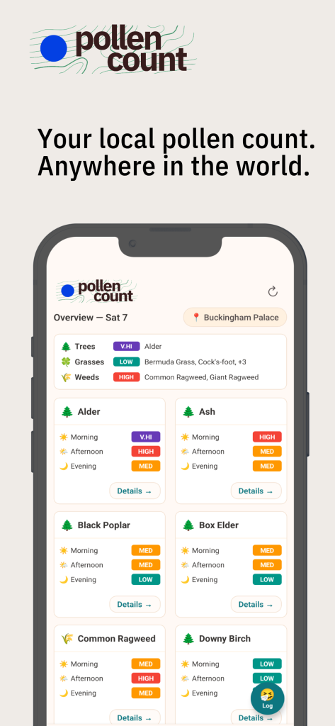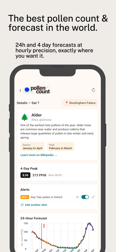 Hour-by-hour predictions for 39 species — trees, grasses, and weeds — with smart alerts, interactive maps, and a symptom diary that learns your triggers.