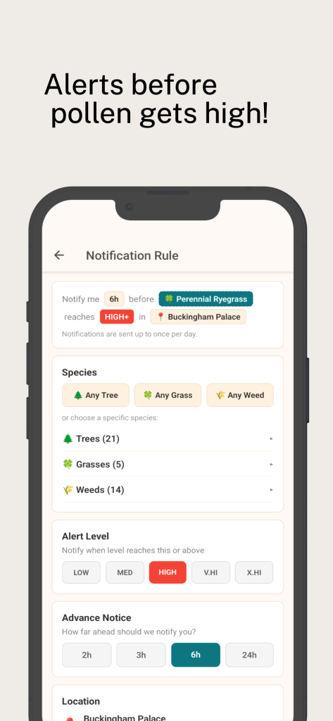 - Receive notification alerts for high pollen hours before it happens