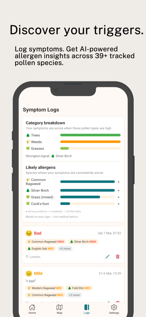 Log how you feel each day. After 10 entries, the app analyses which pollens correlate with your symptoms — surfacing your likely allergens with confidence scores.